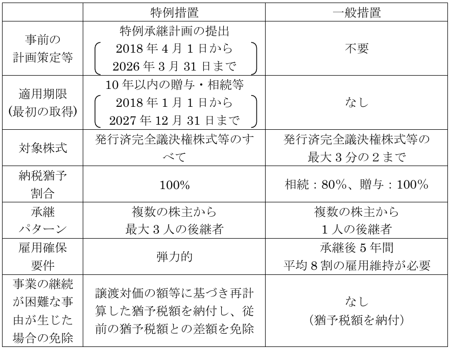 事業承継税制には、主に2つの種類があります。一般措置と特例措置も納税の猶予という基本的な仕組みは同様であるが、制度上、主として以下の表のような違いがある。