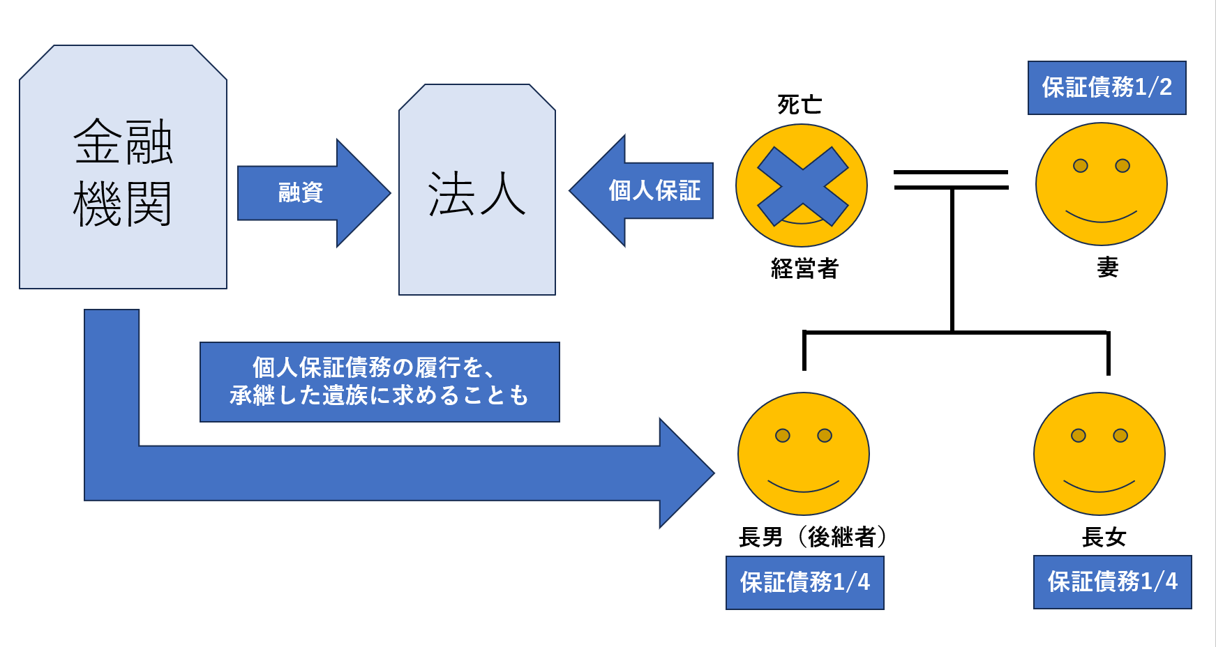 立ち上げ時や資金繰りに困った時に経営者がお金を出して経営を続けていた。さらに金融機関からの借入れに対して、経営者が法人の連帯保証人になって借りている状況で相続が発生。経営者が出していたお金は、経営者が会社にお金を貸していることになった。会社に相続人がいない為、第三者が会社を引き継ぐことになったが、経営者が貸していたお金、金融機関からの借入れに対して会社に返済できる資産が無かった為、そのままになっていた。ワンマン経営で成長していた会社で引き継がれたものの会社は経営が悪化し、金融機関からの借入れの返済が滞った。その際に経営者の個人保証債務を引き継いだ相続人に債務返済を求められた。ここまでの状況を図3にまとめた。その後、経営者が会社に貸していたお金は返済も無く、金融機関からの借入れを相続人が負担していくことになった。