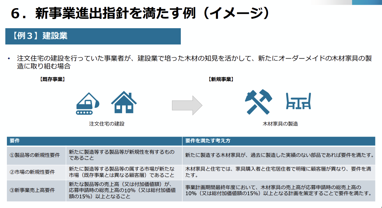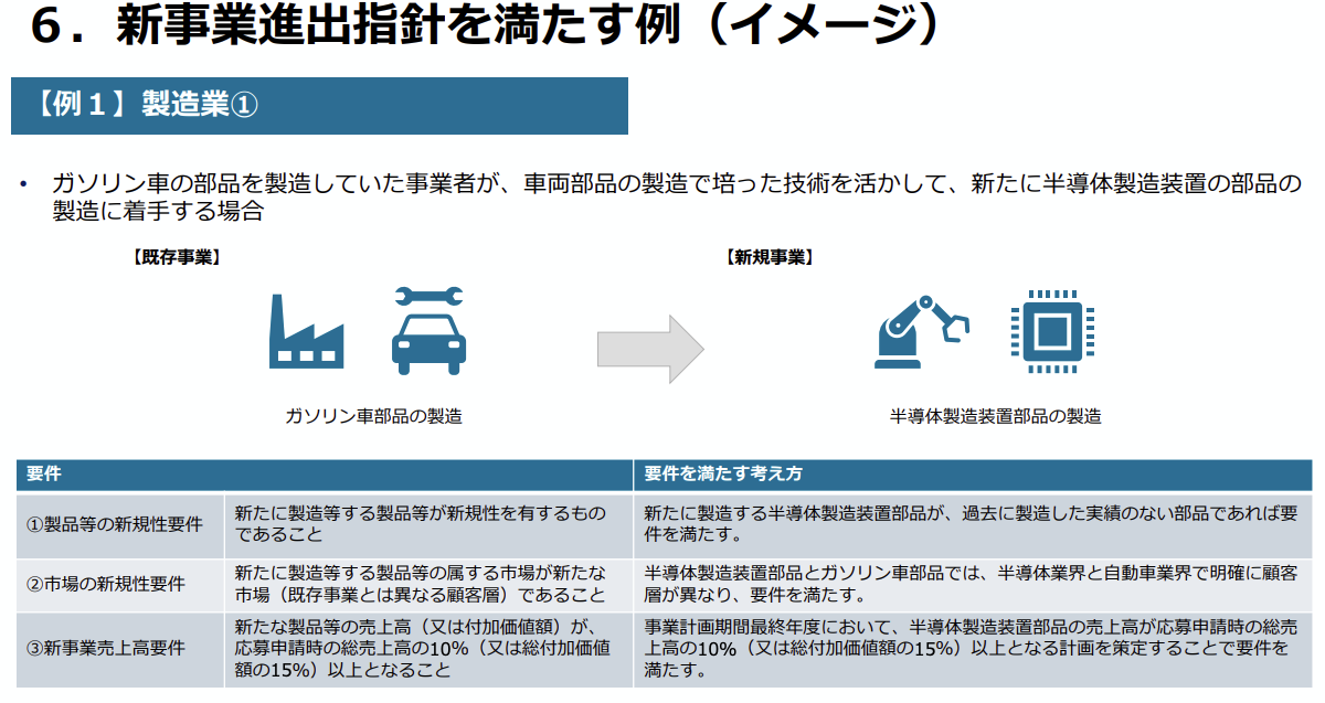 「新事業進出指針の手引き」の15ページ以降に新事業進出指針を満たす例が掲載されています。一例を以下に示します。ご参考にしてください。