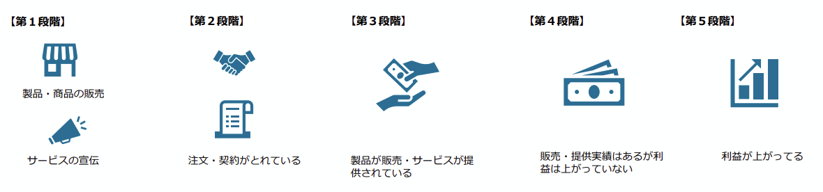 本補助金において「事業化段階」とは下図の通りになります。第1段階以降に該当すると、製品等の新規性要件を満たしません。