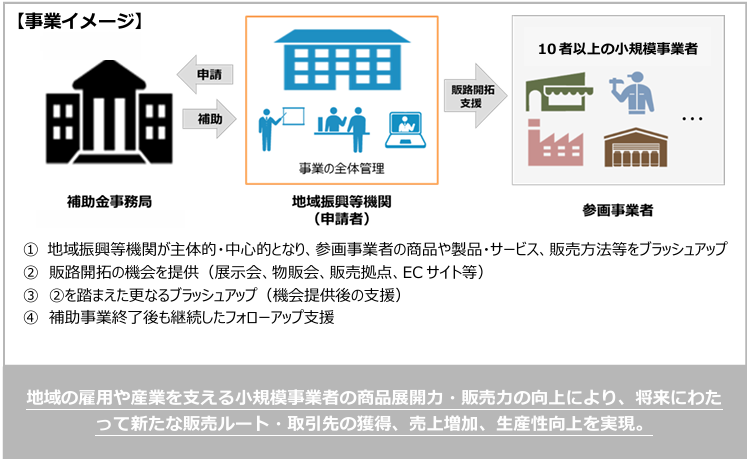 申請主体は、商工会・商工会議所、商店街組織、地域企業の支援に取り組む法人などの「地域振興等機関」となり、10者以上の小規模事業者を参画させることが必要です。