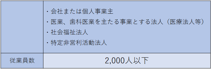 ※1:特定事業者以外に、医業・歯科医業を主たる事業とする法人(医療法人等)、社会福祉法人、特定非営利活動法人についても、従業員数2,000人以下の要件を満たす場合は、特定事業者等の範囲に含まれます。
