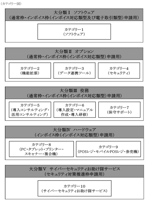 本補助金において登録されるITツールは、下図の大分類及びカテゴリーに分類されます。