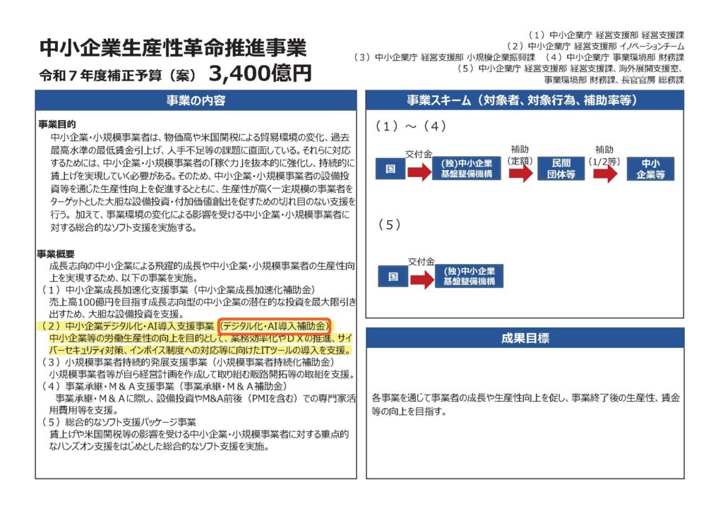 12月2日に中小企業庁が公表した「令和7年度補正予算案の事業概要(PR資料)」では、総額3,400億円の中小企業生産性革命推進事業の1つとして「中小企業デジタル化・AI導入支援事業(デジタル化・AI導入補助金)」という文言が明記されています。