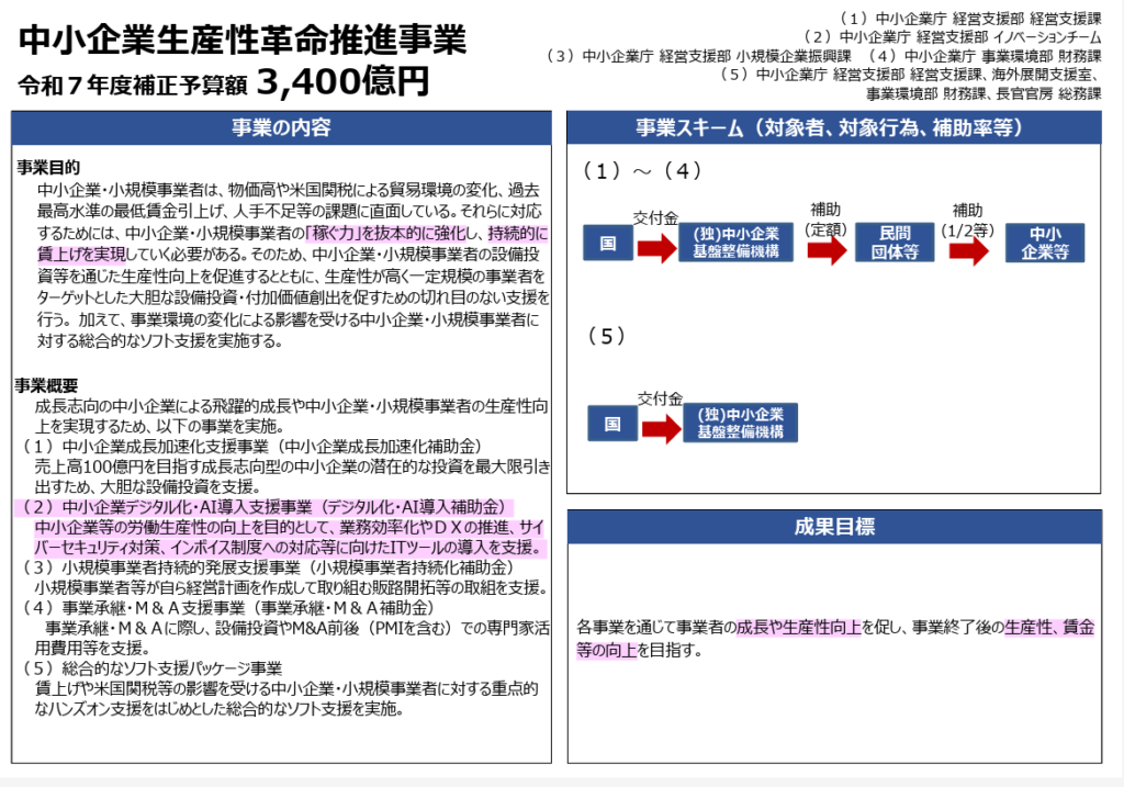 令和7年度補正予算案の段階では存在したIT導入補助金が、経産省のPR資料では「デジタル化・AI導入補助金」へと名称が刷新されました。