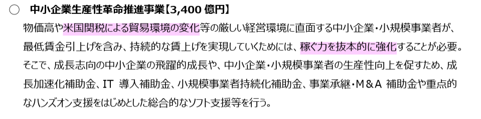 補正予算案では、物価高や人手不足といった課題に対し、「稼ぐ力の抜本的強化」が必要であると定義されています。