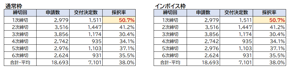 通常枠・インボイス枠ともに1次公募の採択率が最も高く、以降は回を追うごとに減少傾向にあるという点です。