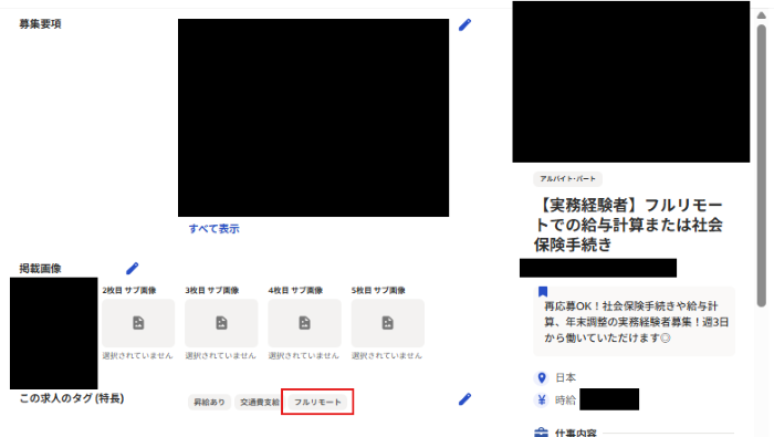 「フルリモート」(または「完全在宅」)タグを選択。これによりリモートワーク希望者が検索しやすくなります。