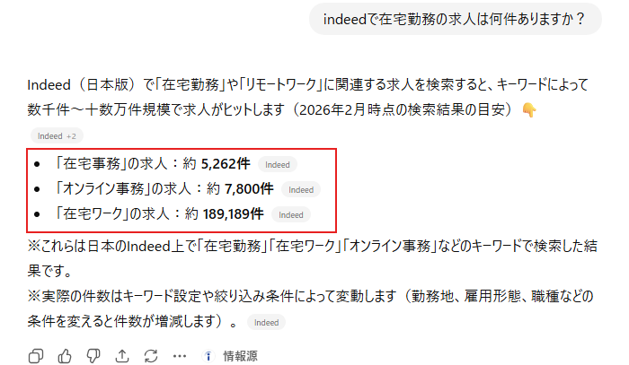 まずは Indeed でリモートワークの求人がどれぐらいあるかを見てみましょう。indeed・チャットGPT(AI)で検索、確認をしました。