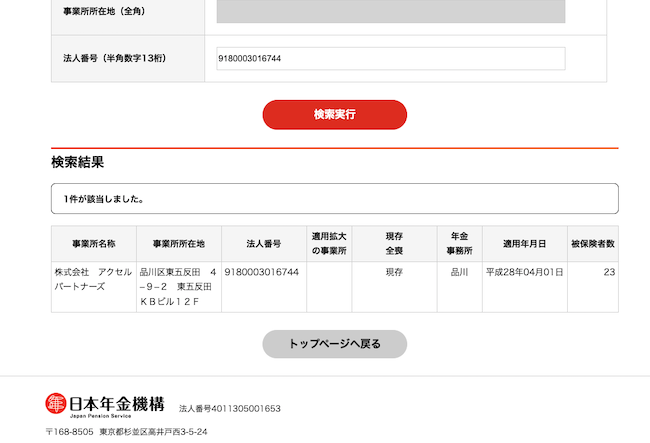 そういう時に活躍するのが日本年金機構が公開している厚生年金保険・健康保険 適用事業所検索システムです。