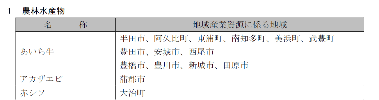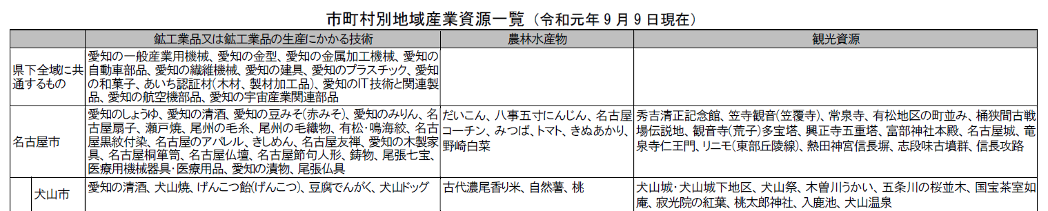 愛知県では、地域資源を活用して新たな事業展開に取り組む中小企業を支援しています。 「中小企業による地域産業資源を活用した事業活動の促進に関する法律」に基づいて、地域産業資源を指定しているので、参考にしてみてください。 ≪地域産業資源の内容≫ ■ 地域産業資源の市町村別一覧[PDF形式:277KB]