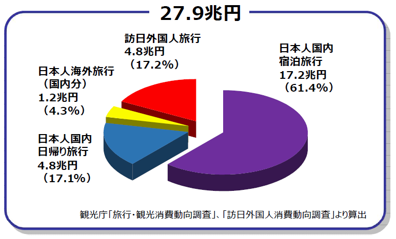 観光庁の「旅行・観光消費動向調査」2019年(確報)をみると、次のような結果が出ています。 日本の旅行消費額27.9兆円のうち、訪日外国人旅行は4.8兆円で、17.2%である。