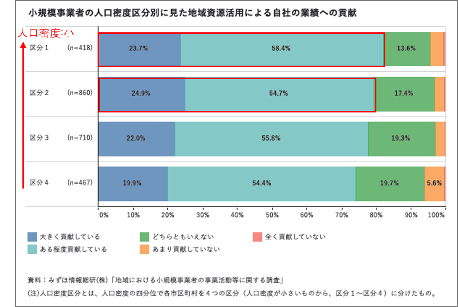 従業員が20名以下の小さな規模の事業者(小規模事業者)は、経営資源(ヒト・モノ・カネ)が少ないことが多いので、地域資源を活用することが重要です。 「人口密度の低い地域ほど、地域資源を活用することによって自社の業績が良くなっている」というデータがあります。